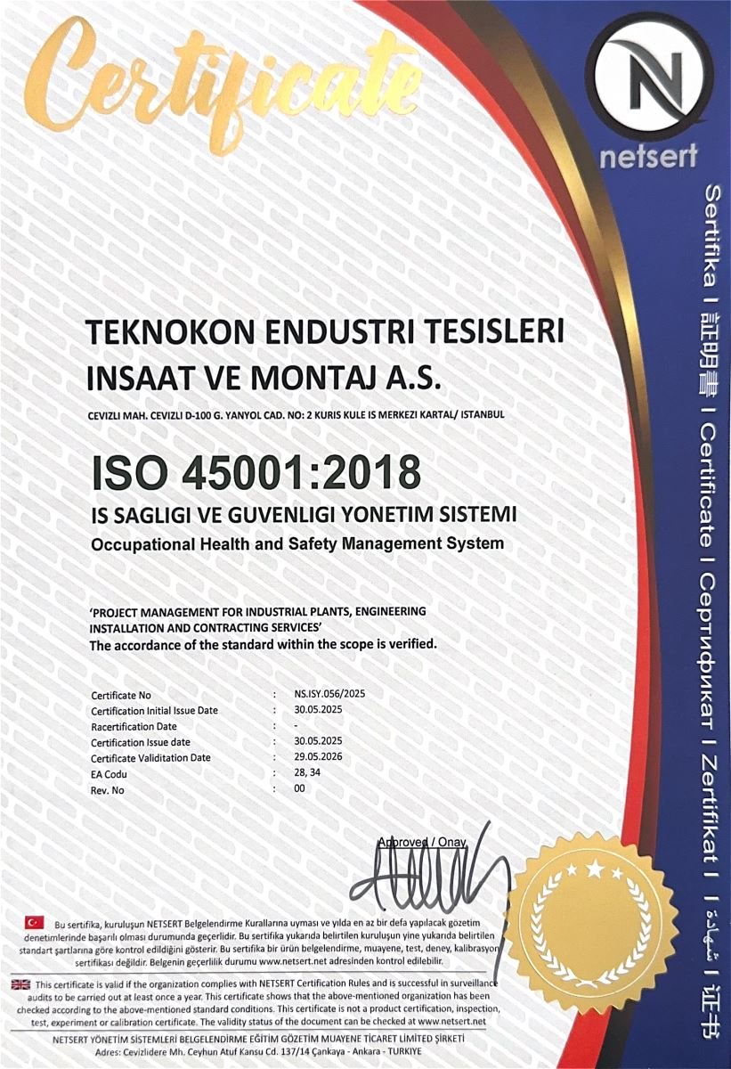 Teknokon Endüstri is certified with ISO 9001, ISO 14001 and ISO 45001. These certificates have clarified all the steps that our company follows in terms of HSE in all projects.